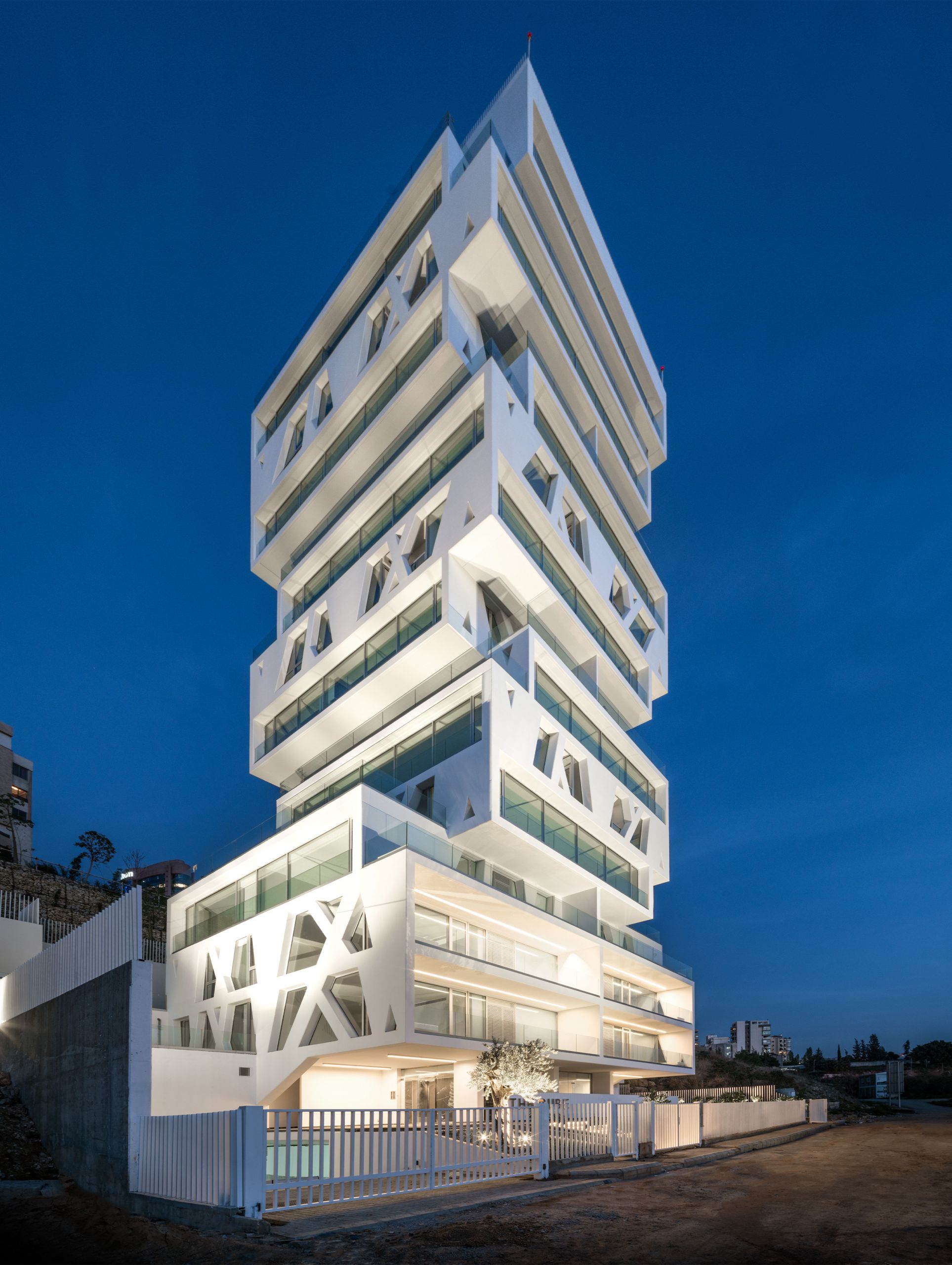The design with the 14 stacked and rotated floor plans generates 21 attractive apartments in total, ranging in size from 117 to 234 m², with fluid spaces, large balconies and wall to wall window frames. With its freestanding setting on the edge of the city, both the view on the Cube itself and on central Beirut are unique; the vibrant City is your personal wallpaper, day and night.