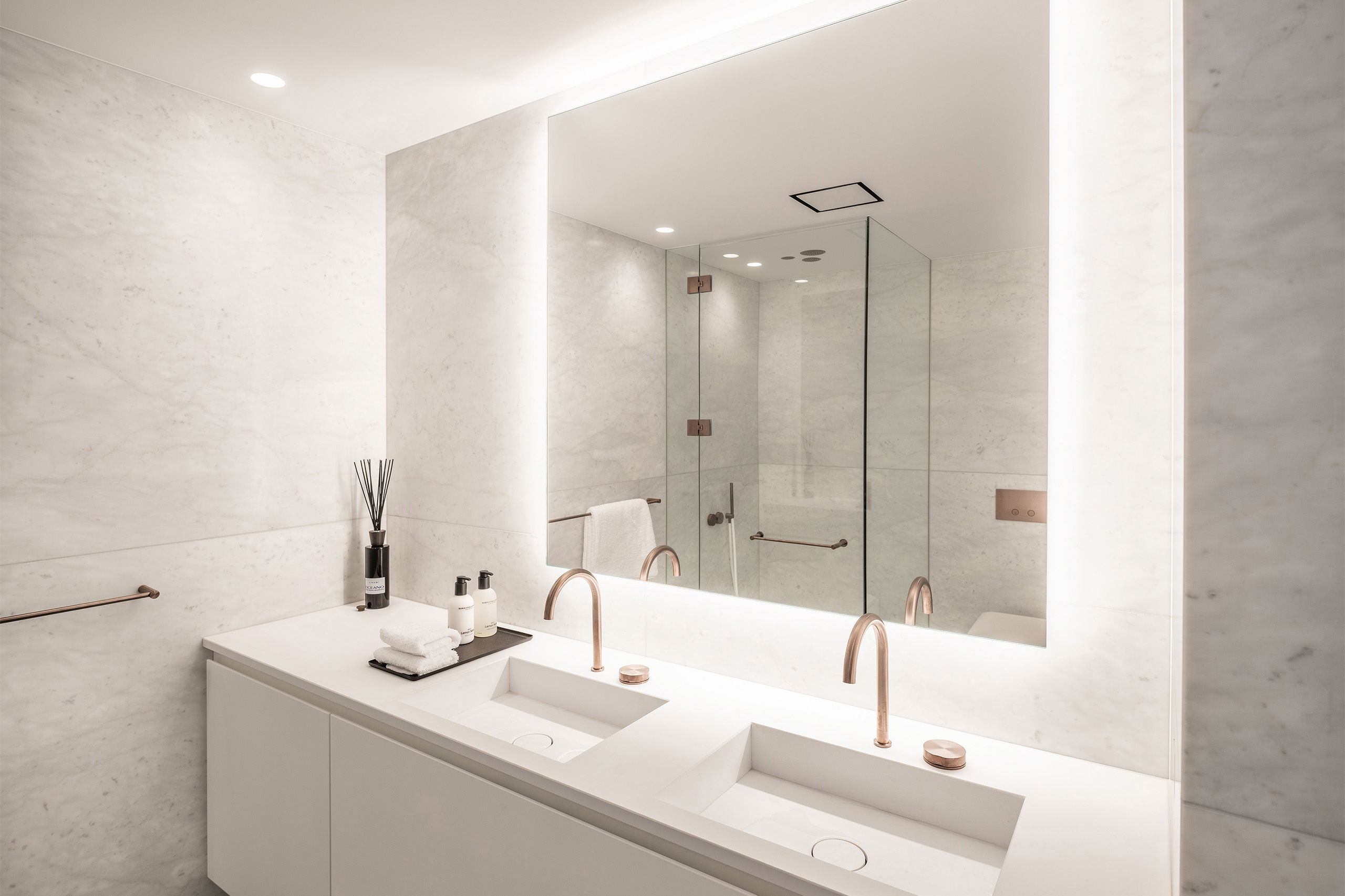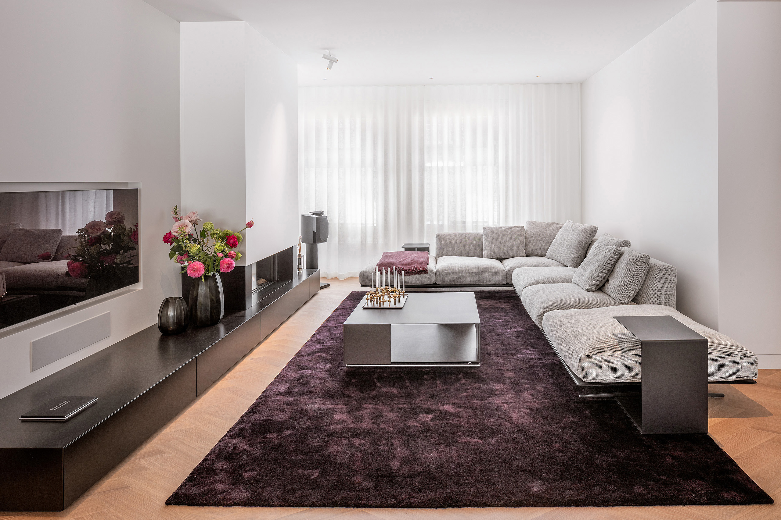 The extension and renovation of a three-story Amsterdam apartment have resulted in a bright and inviting home. A transparent glass façade slides open to connect the interior with the garden, visually expanding the living space. The modification of the two bay layouts into a single space allowed for a spacious open kitchen, becoming the heart of the home. The luminous atmosphere extends throughout the residence, including the bedrooms and bathrooms, where a light and airy ambiance prevails. The use of a white marble finish enhances the overall brightness and creates a sense of timeless elegance.