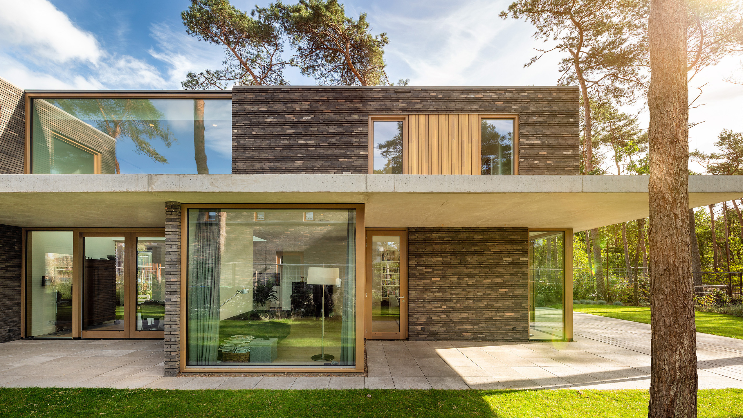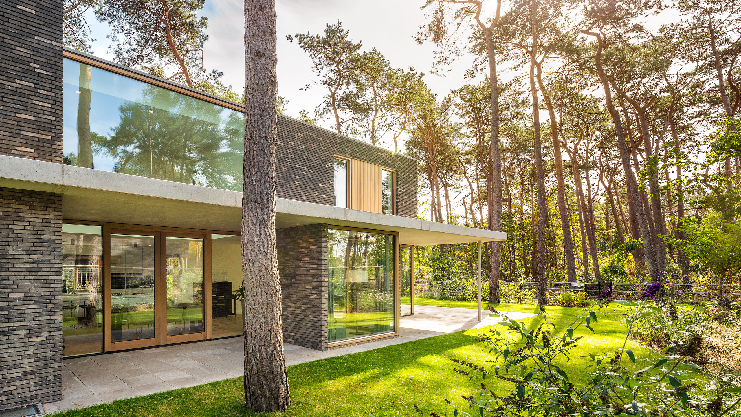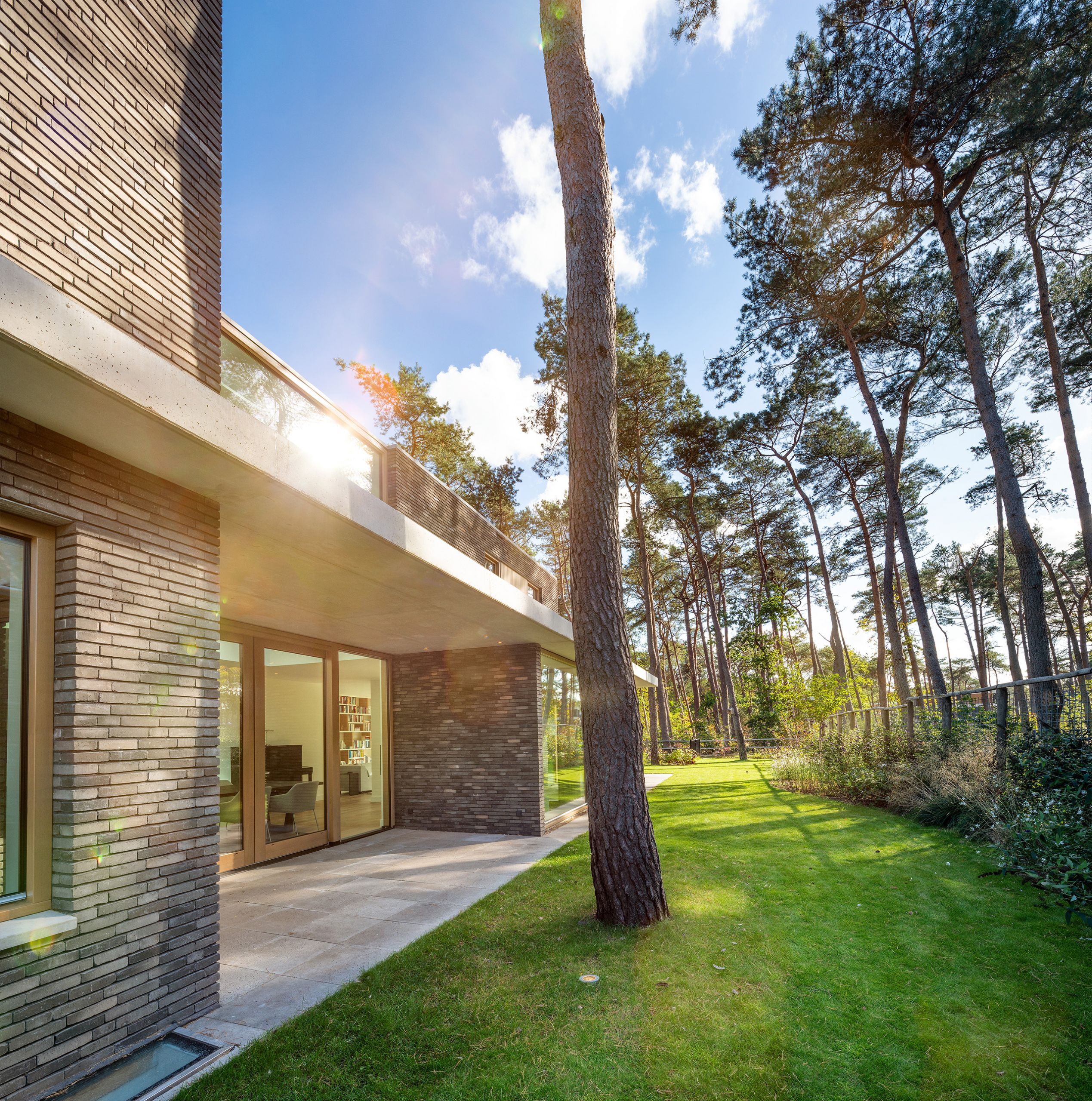 Situated in the pine woods, Villa Zeist 2 adds a strong horizontal line to the vertical nature of its surroundings. A concrete canopy connects the different brick volumes of the villa, which reflect the wishes of the family. Their house is conceived as a series of interconnected rooms which provide intimacy and offer views to the woods and the sky.