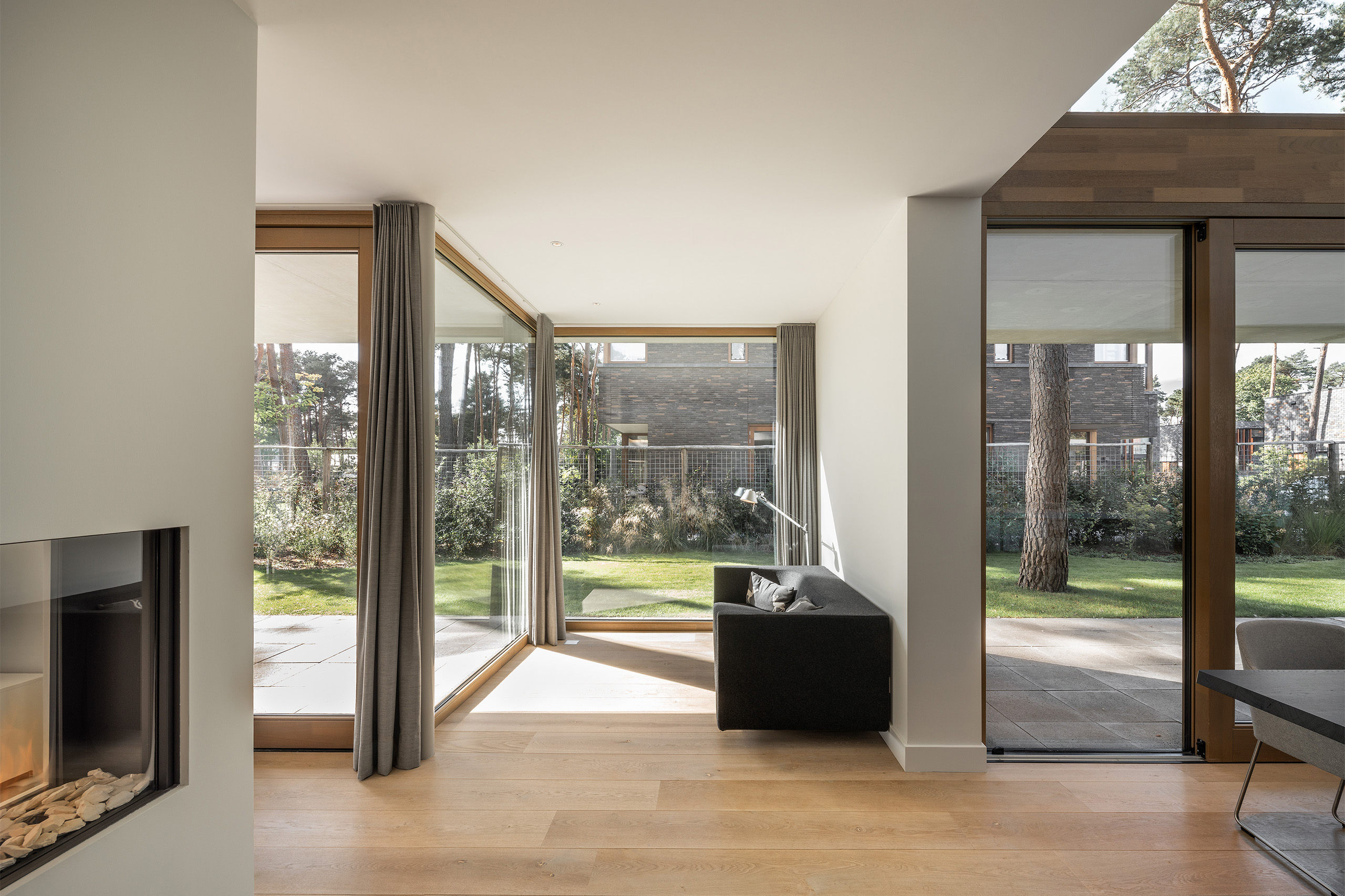 In the interior, these pockets strongly enhance the richness of the spaces within the volumes. They serve the client’s wish for privacy twofold. On the one hand, the shaped distance between the separate volumes provides intimacy to the rooms. On the other hand, the pockets allow to open the volumes in multiple directions to reduce the number of windows facing the direct neighbours. In some places, the floor to floor openings and sliding doors make the woods feel very close, while in other rooms carefully shaped windows frame specific perspectives.