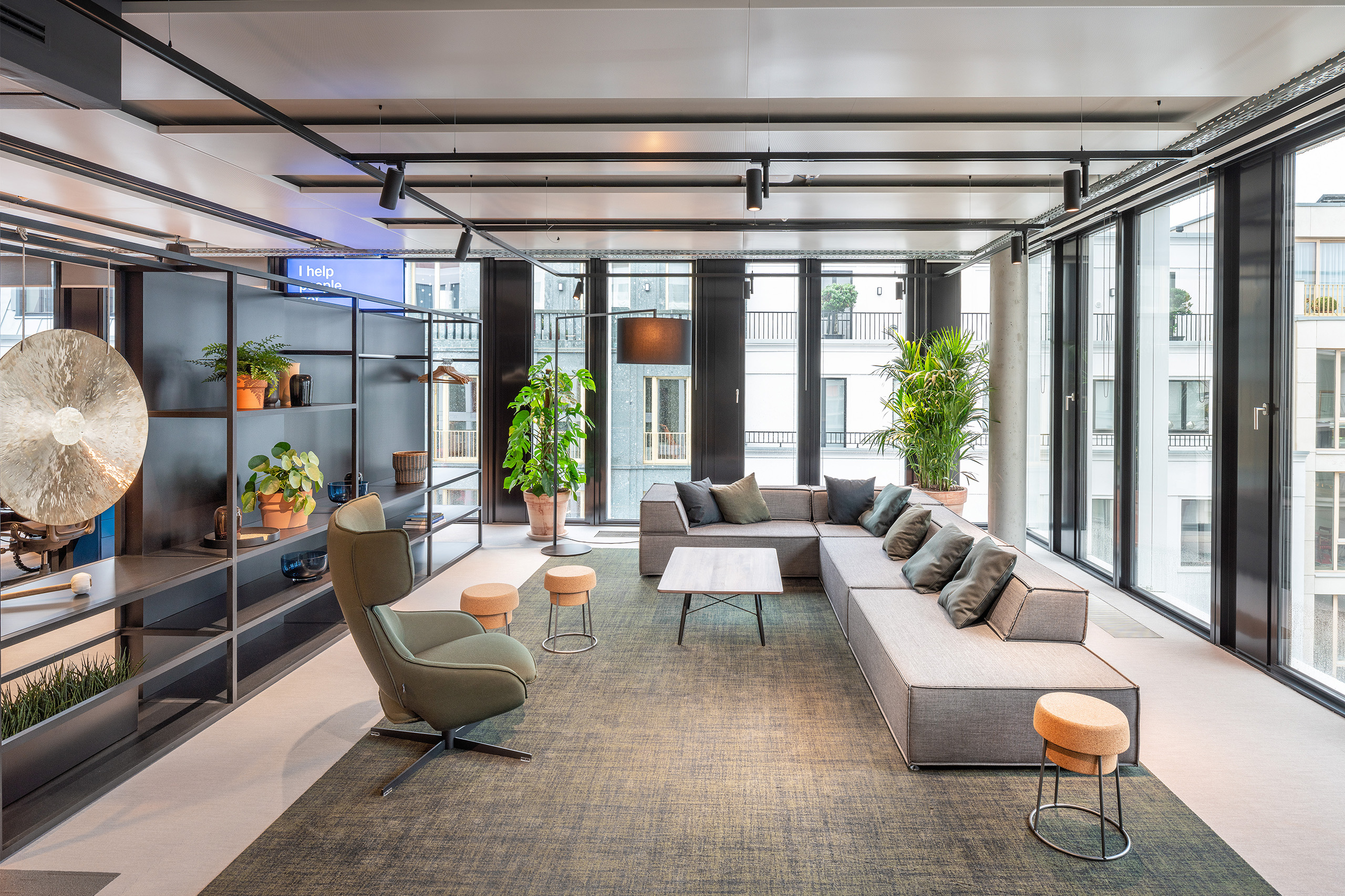 The office is situated in a courtyard office building with big open plans. HofmanDujardin designed custom-made frame elements that introduce a human scale. These feature plants, styling elements, and work-related devices like screens or sales gongs but also double as wardrobes. Moreover, the frame elements form natural partitions between the workstations and the informal lounge areas. Strategically placed around the building’s corners, these lounges invite employees to take a break or conduct an informal meeting whilst admiring views over the Düsseldorf cityscape.