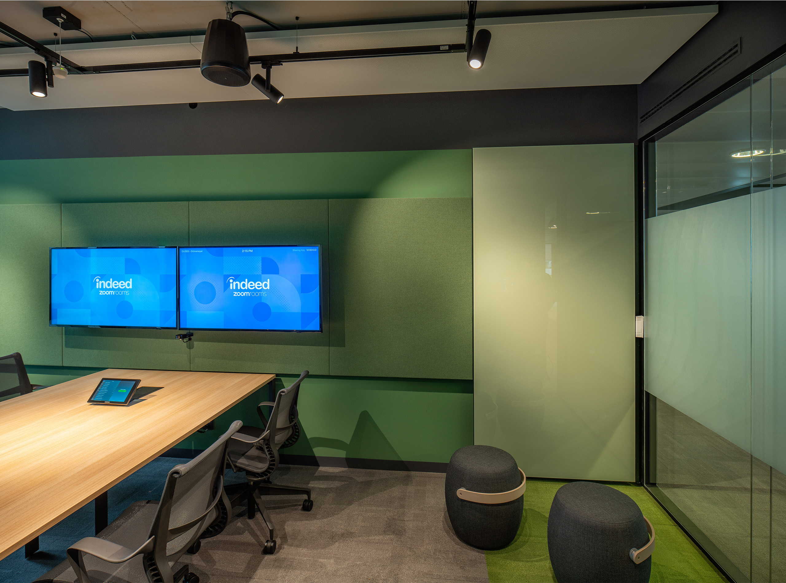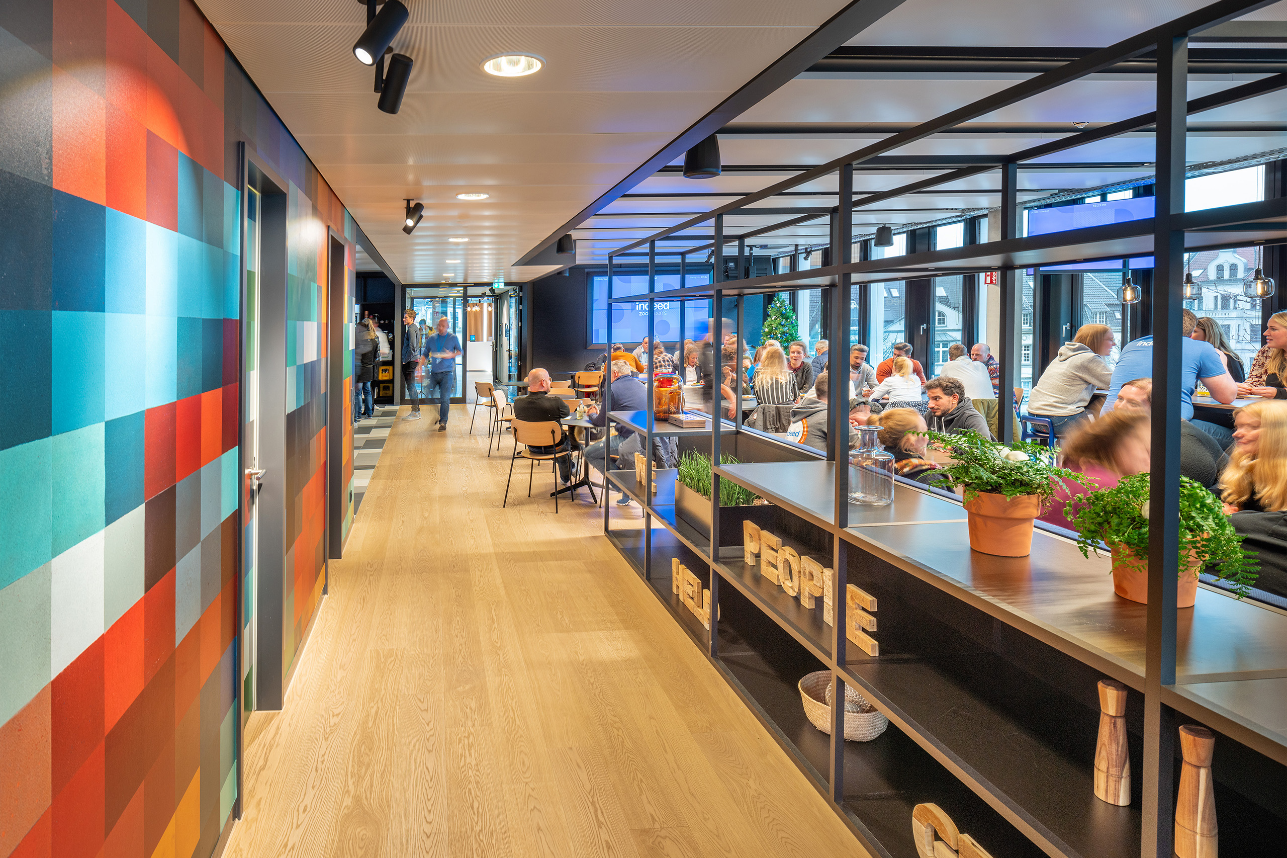The design of the Indeed office in Düsseldorf combines a strong local character with an internationally focused working environment. The warm and colorfully textured office provides the employees with a homey and comfortable atmosphere to work in. Recognizable and well-equipped meeting rooms allow them to meet remotely and in person with colleagues from all over the world.